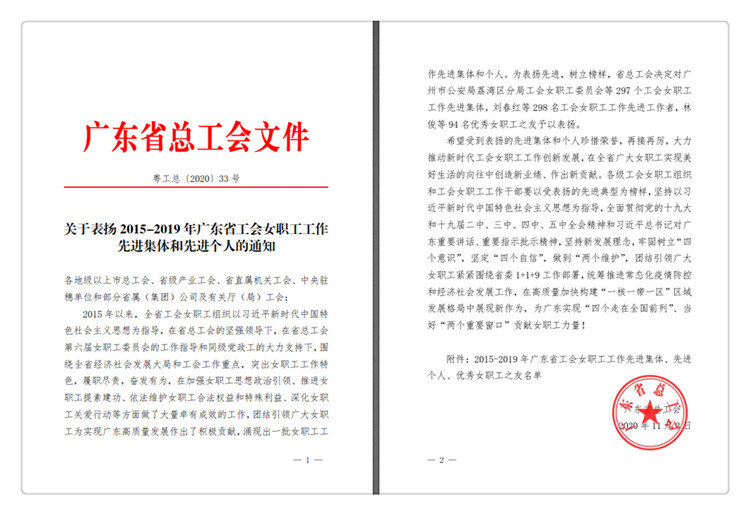近日,从广东省总工会传来喜讯,我公司被评为“2015-2019年广东省女职工工作先进集体”,特此报喜。