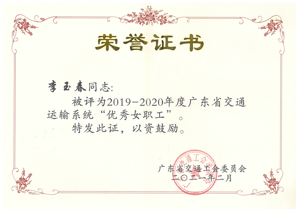 近日,公司工会被广东省交通工会委员会授予2019-2020年度广东省交通运输系统“先进职工之家”荣誉称号;公司董事长李江山同志被评为2019-2020年度广东省交通运输系统“优秀职工之友”,人力资源部主任李玉春同志被评为“优秀女职工”。