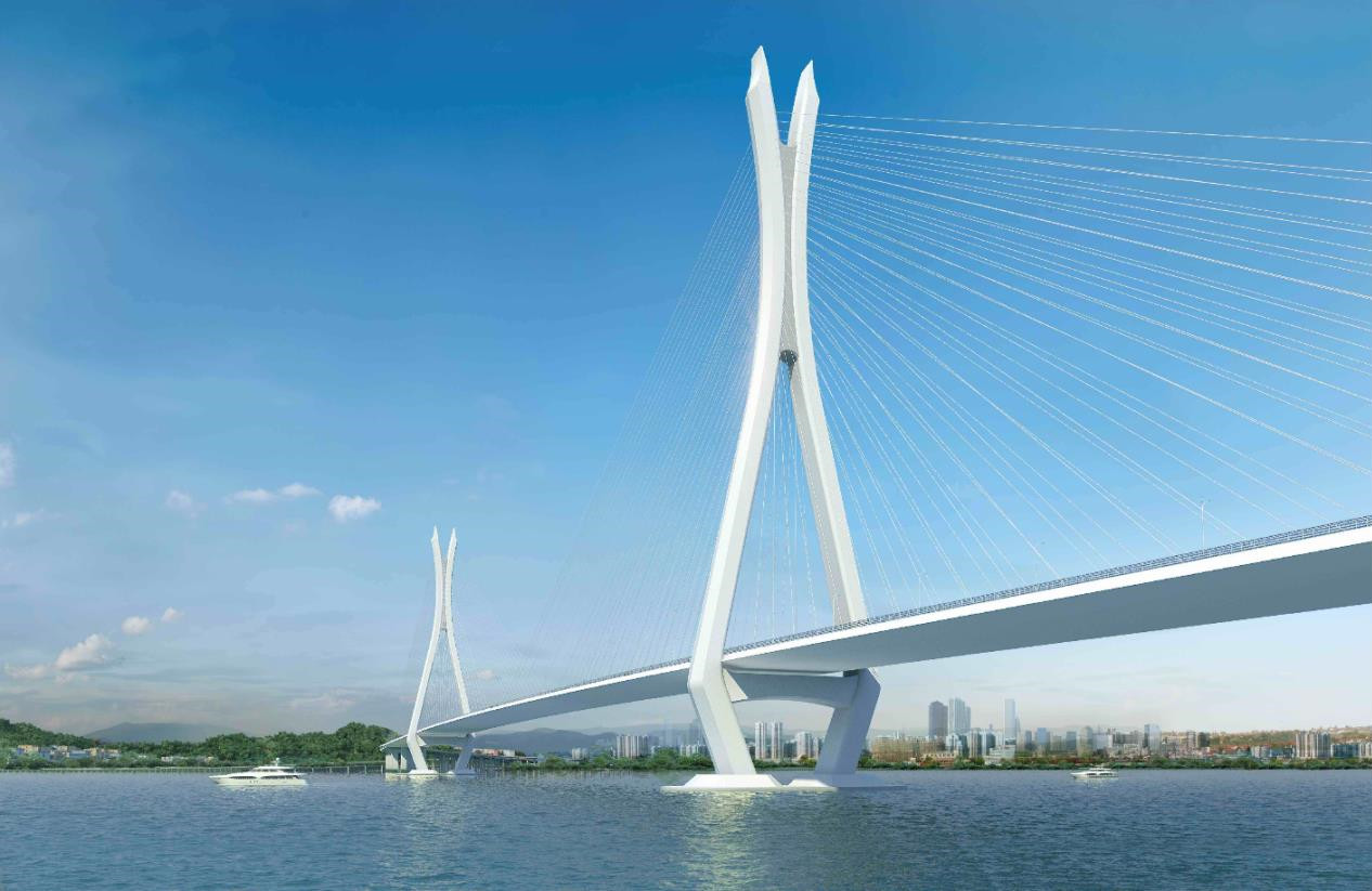 主桥创新性地运用了超高性能混凝土(UHPC)桥面板,鉴于其高抗拉、高抗压、氯离子扩散系数低、吸水性低、蒸养后的收缩为零且徐变小、耐久性高、使用寿命长、后期维护费用低、经济性好等突出的高性能优点,以其代替正交异性钢桥面板及普通混凝土桥面板,有效解决长期困扰工程界的桥面板开裂及耐久性难题。该桥梁方案在同类组合梁斜拉桥中为世界首创。