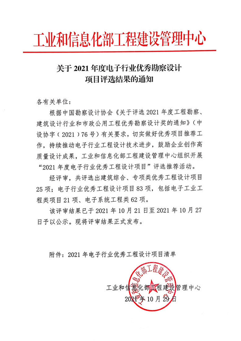 近日,我公司承担的“广东省南沙大桥(原称虎门二桥)工程机电设计施工总承包”项目荣获工业和信息化部工程建设管理中心“2021年度电子行业优秀工程设计项目”电子系统工程类一等奖。这是公司首次获得电子行业设计奖项,标志着我公司的智慧化设计能力在电子系统工程领域获得了外部肯定和认可。