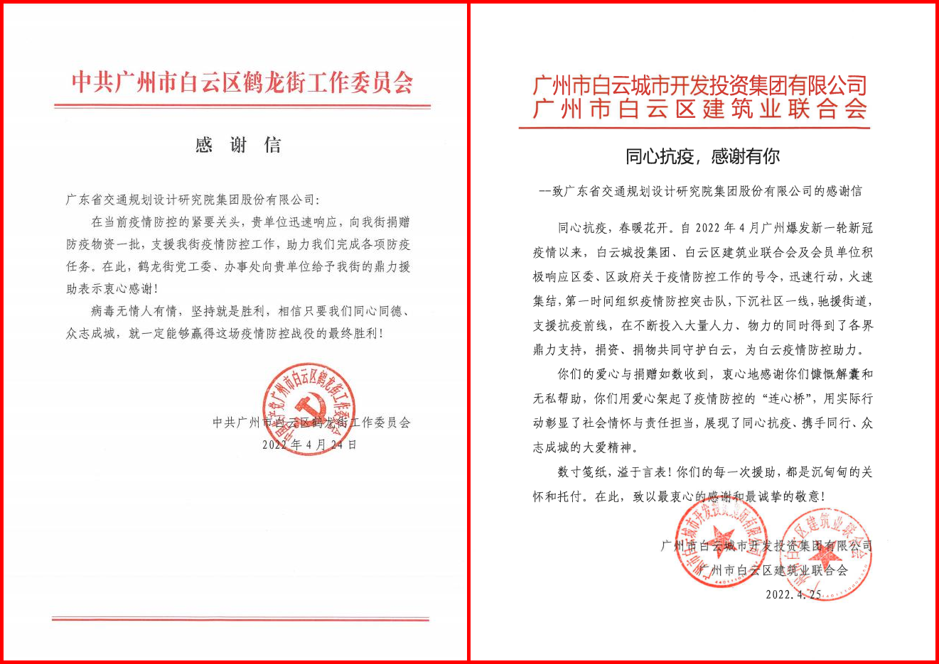 集团收到白云区鹤龙街党工委、白云城投集团感谢信