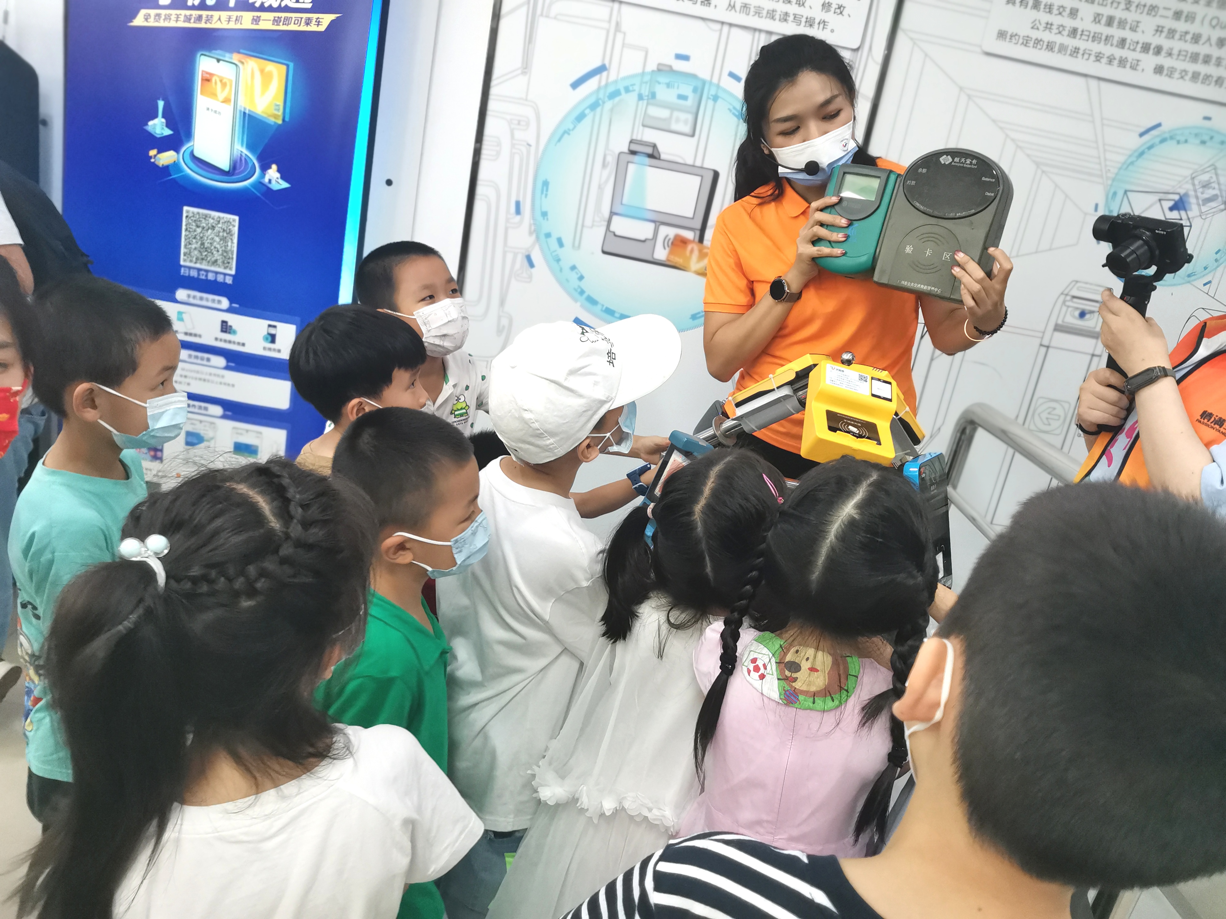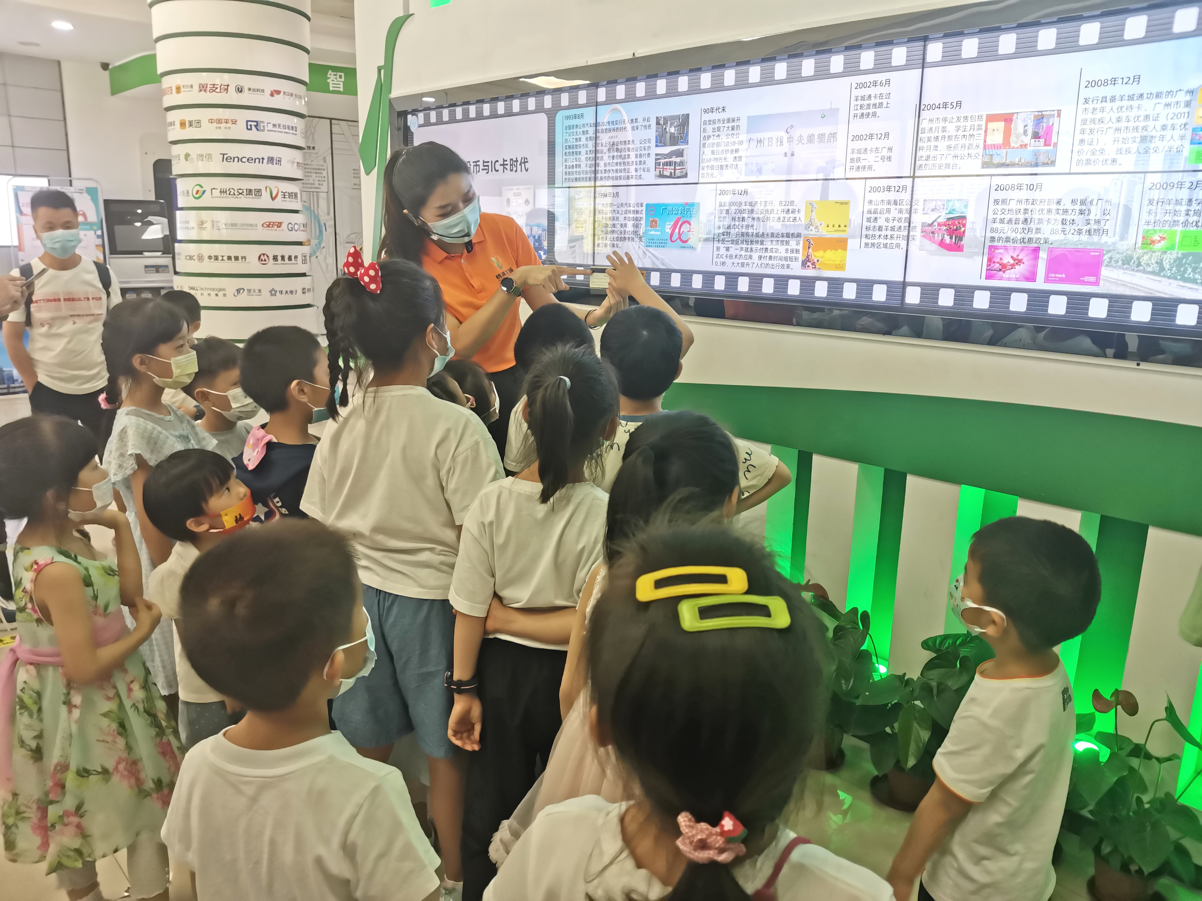 小朋友们在爸爸妈妈的陪同下来到科普基地,通过讲解员小姐姐口头阐述和实物展示相结合的形式,学习了广州公共交通支付方式的发展史——从人工售票、纸质月票、自觉投币到如今的一卡通(IC卡电子支付),还学习了卡片、电子芯片的制作工艺以及智慧支付技术等多方面知识。