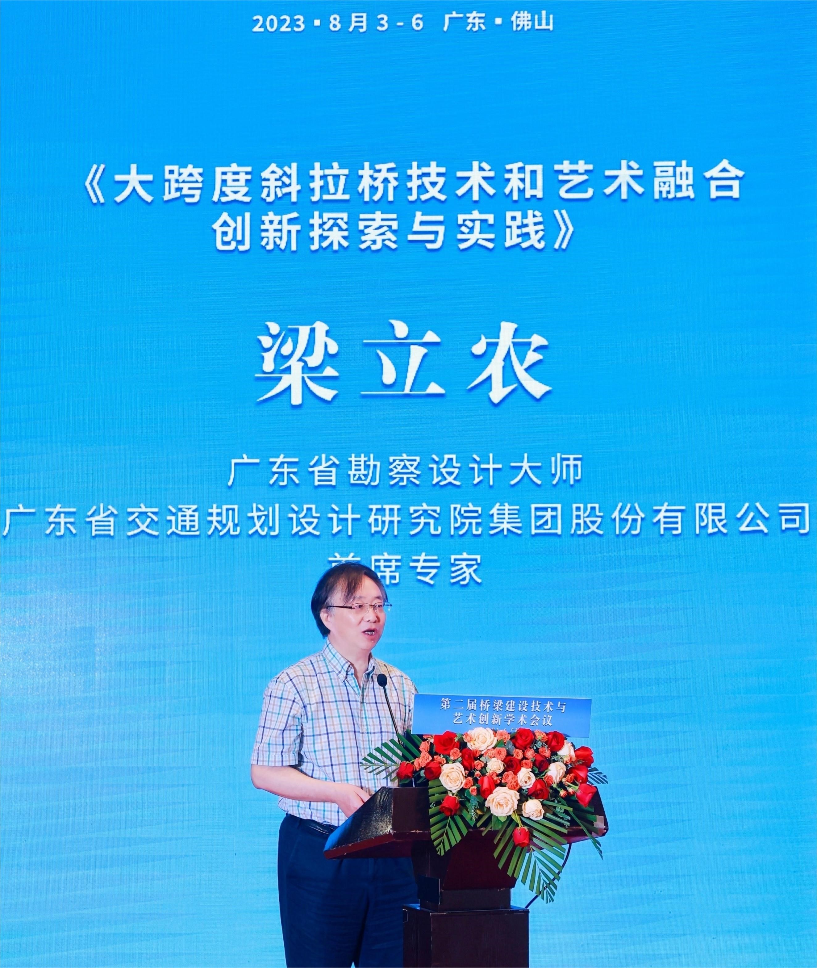 公司总工程师孙向东应邀担任主旨报告会场主持人。广东省工程勘察设计大师、公司首席专家梁立农作了题为《大跨度斜拉桥技术和艺术融合创新探索与实践》的主旨报告。报告从技术与艺术融合创新的角度,全面总结分享了近年来公司完成的混凝土斜拉桥、钢斜拉桥、混合梁斜拉桥、矮塔斜拉桥、钢桁梁双层斜拉桥、组合梁斜拉桥等工程的技术难点与艺术创新点,提出了技术与艺术融合的美学设计原则。