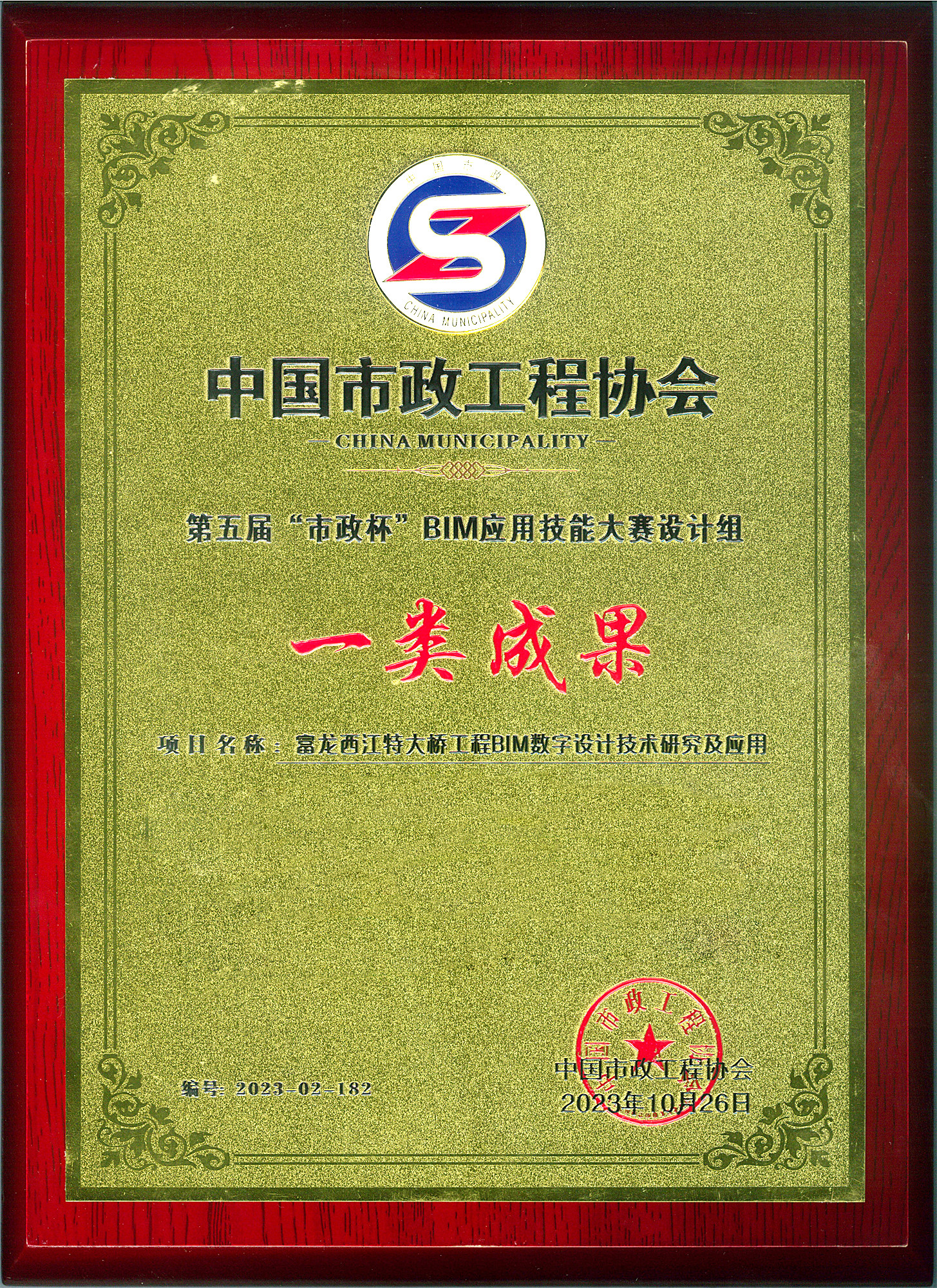 11月10日,2023年度中国市政工程协会第五届“市政杯”BIM应用技能大赛颁奖典礼在佛山市隆重召开。经过一审、二审和终审答辩,公司《富龙西江特大桥工程BIM数字设计技术研究》从全国575个参评BIM项目的激烈竞争中脱颖而出,荣获设计组一类成果(一等奖)。自去年《滨海湾大桥正向设计与数字化建造》项目获奖后,公司再次荣获该奖项一类成果(一等奖)。