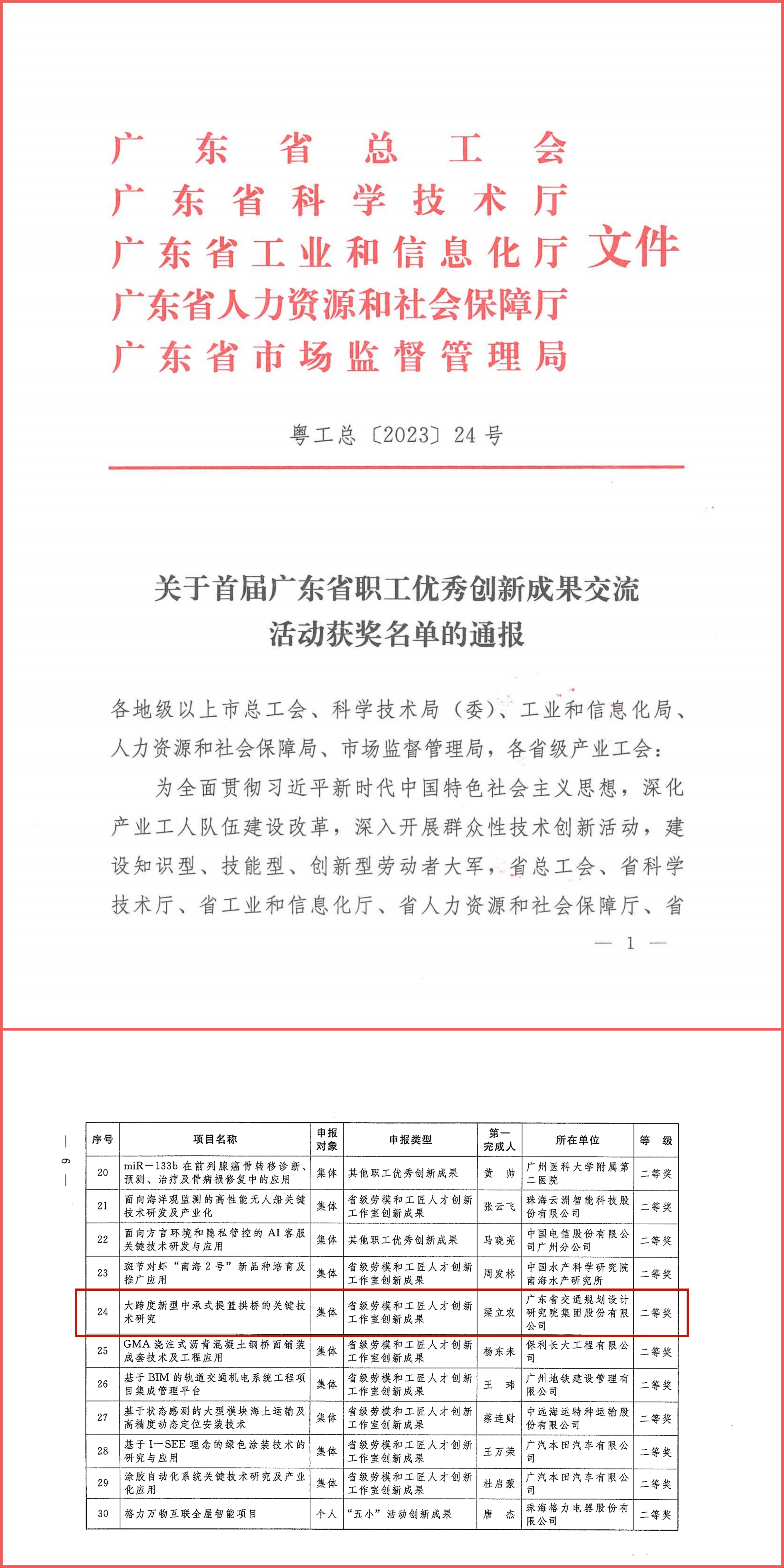 近日,公司梁立农创新工作室《大跨度新型中承式提篮拱桥的关键技术研究》项目获广东省职工优秀创新成果二等奖。