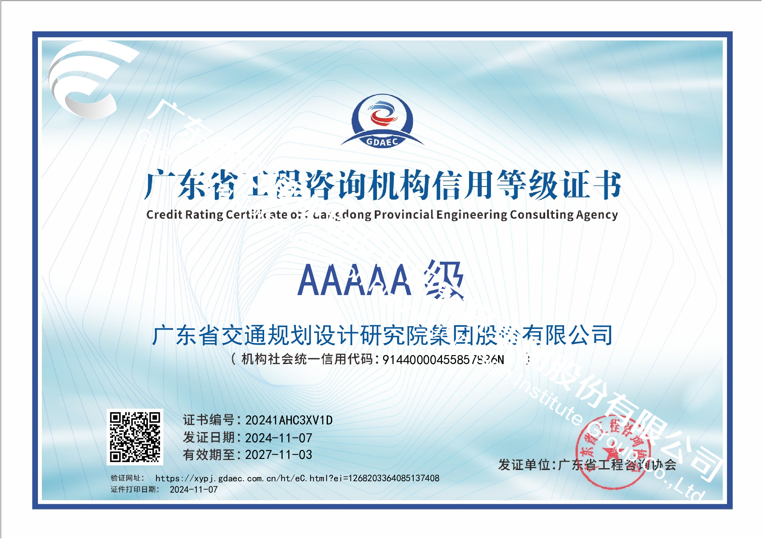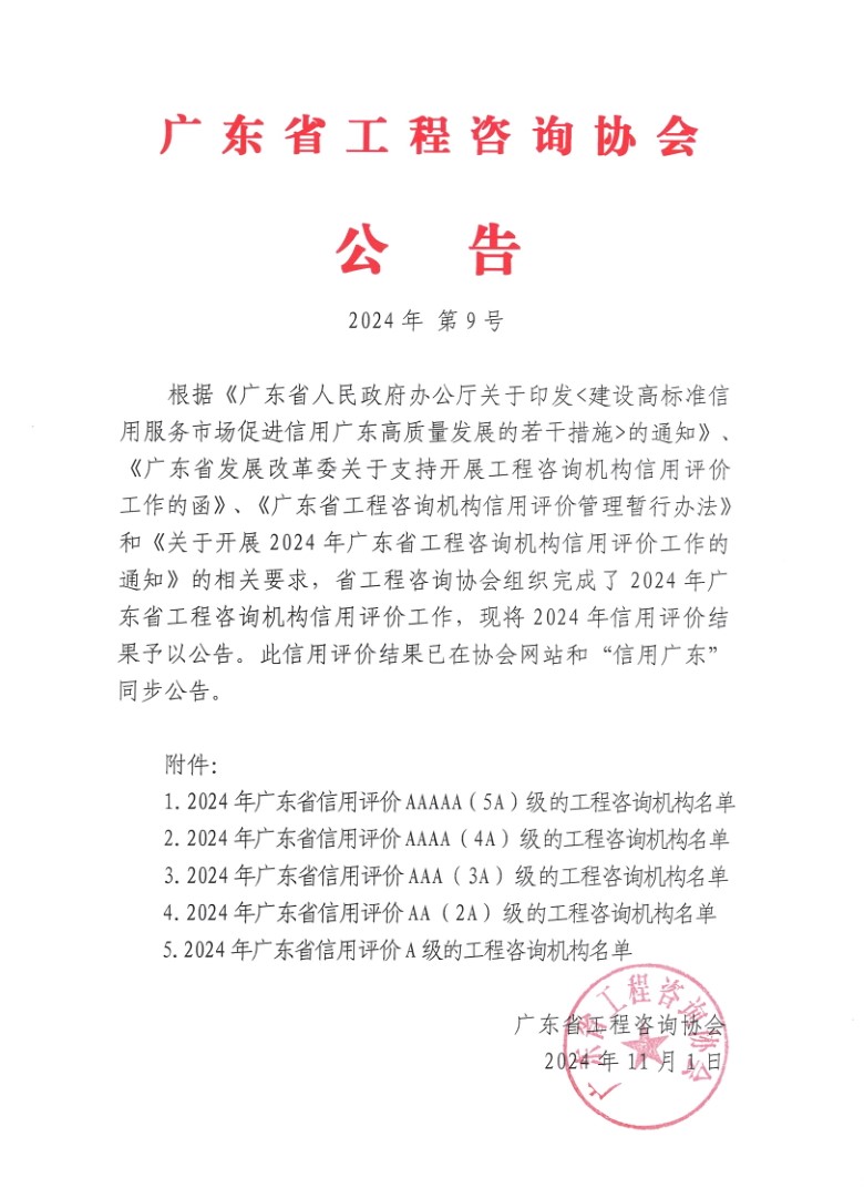 近日,广东省工程咨询协会正式发布《2024年度广东省工程咨询机构信用评价等级结果》(为首次评定),公司获评为“广东省信用评价AAAAA5A)级工程咨询机构”,5A为评定最高级别。