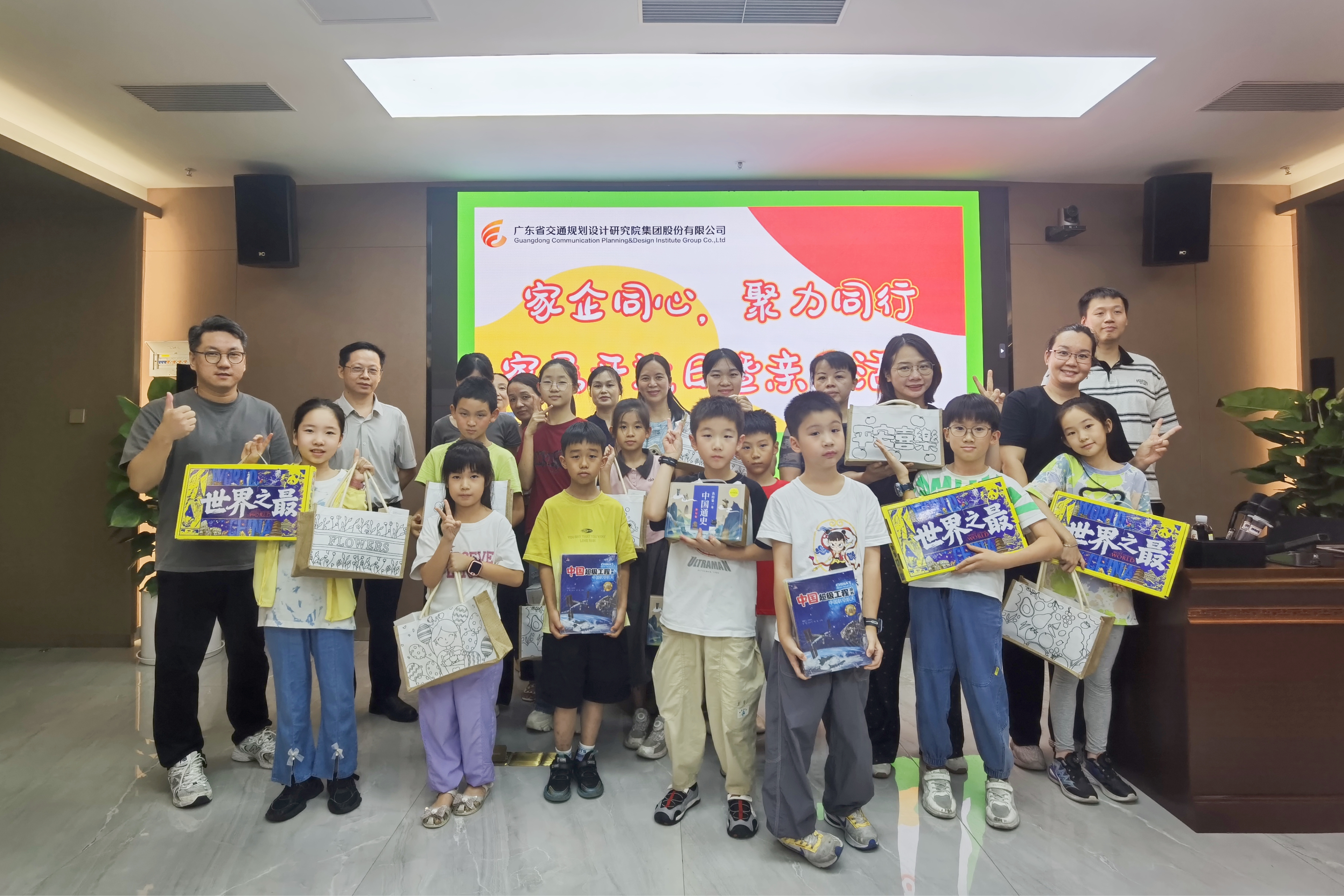 手工环节中,公司工会为每组家庭准备了饱含心意的“成长礼包”:涵盖中小学生适龄读物、环保颜料和画笔等创意工具,以及公司定制笔记本、水杯、雨伞等实用纪念品。公司副总经理、工会主席陈贤文亲自将礼包递到孩子们手中,鼓励他们“保持好奇,勇敢创作”,并与大家一同合影留恋,定格温馨瞬间。