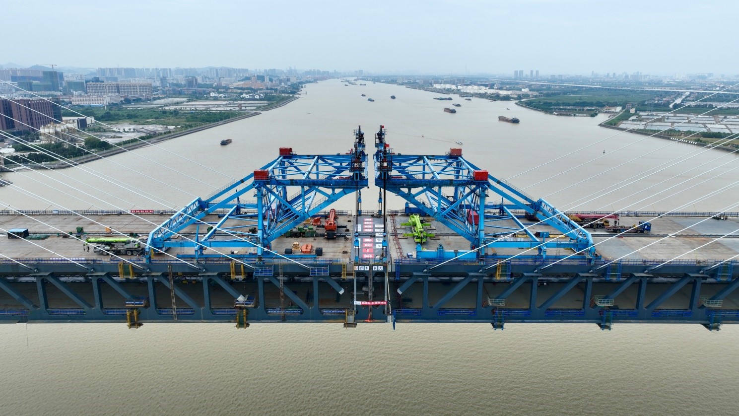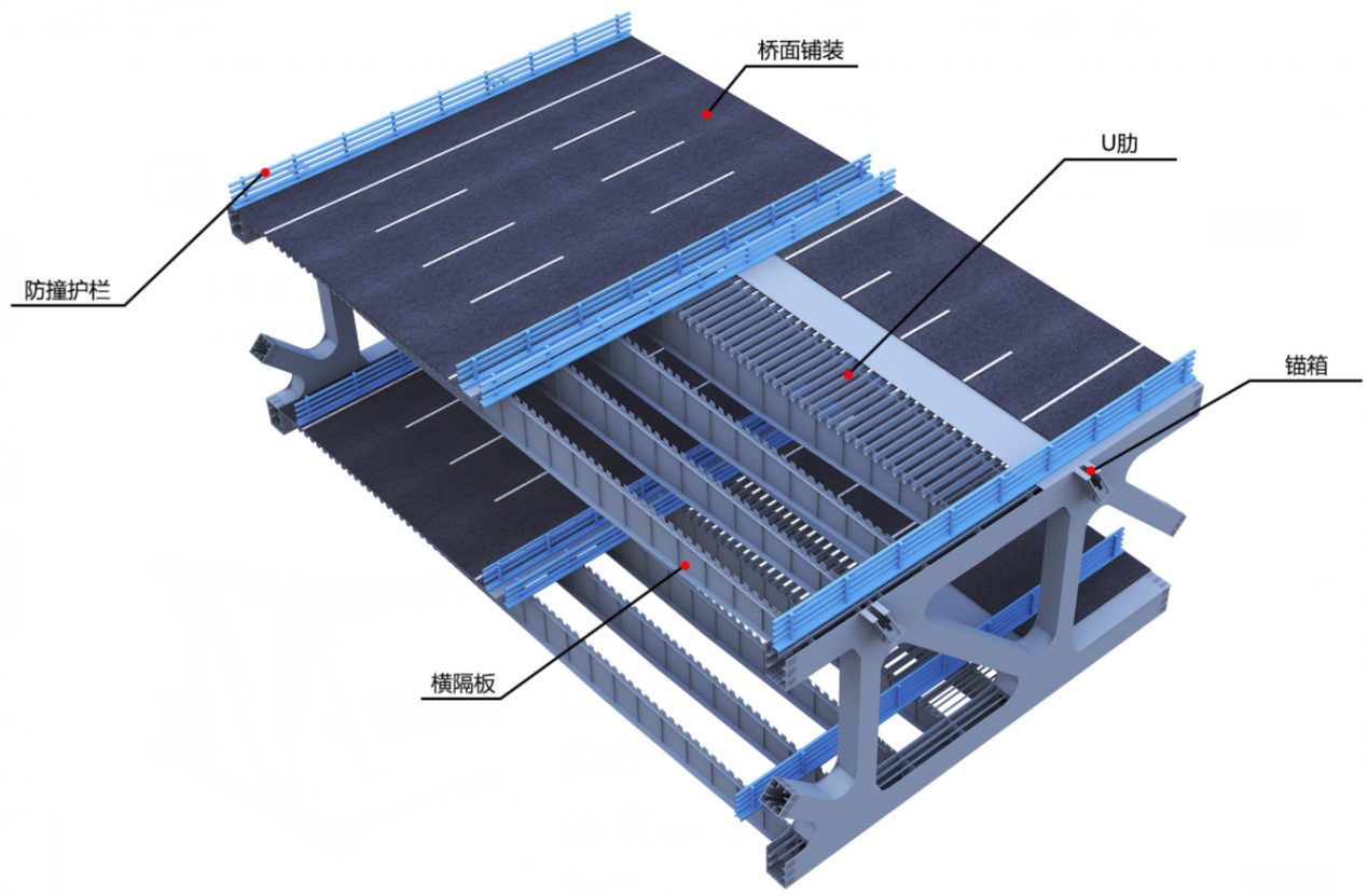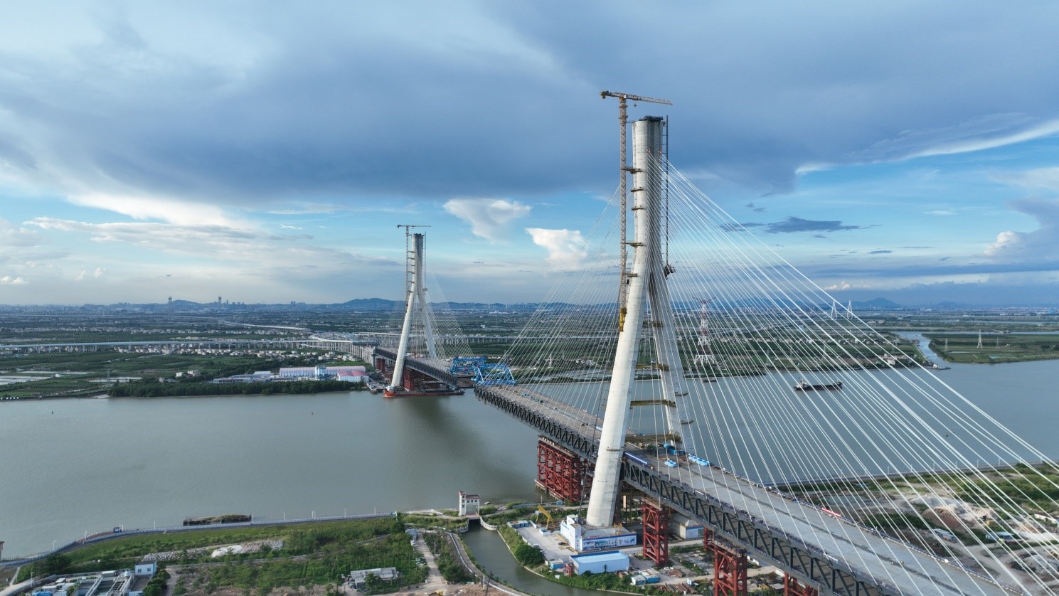 主梁采用超宽双层钢桁梁结构,全宽达42.2m。桥面采用密横梁体系,具有结构简洁、横向刚度均匀、横梁抗疲劳性能优良等特点。索塔两侧各布置30对平行钢丝斜拉索,最大索力达970吨。边跨下层采用混凝土面板压重方案,通过采取合理的混凝土面板布置及施工顺序,有效解决施工过程中桥面板易开裂的难题,横向钢混结合段采用UHPC混凝土,显著提升桥面板抗裂性能。