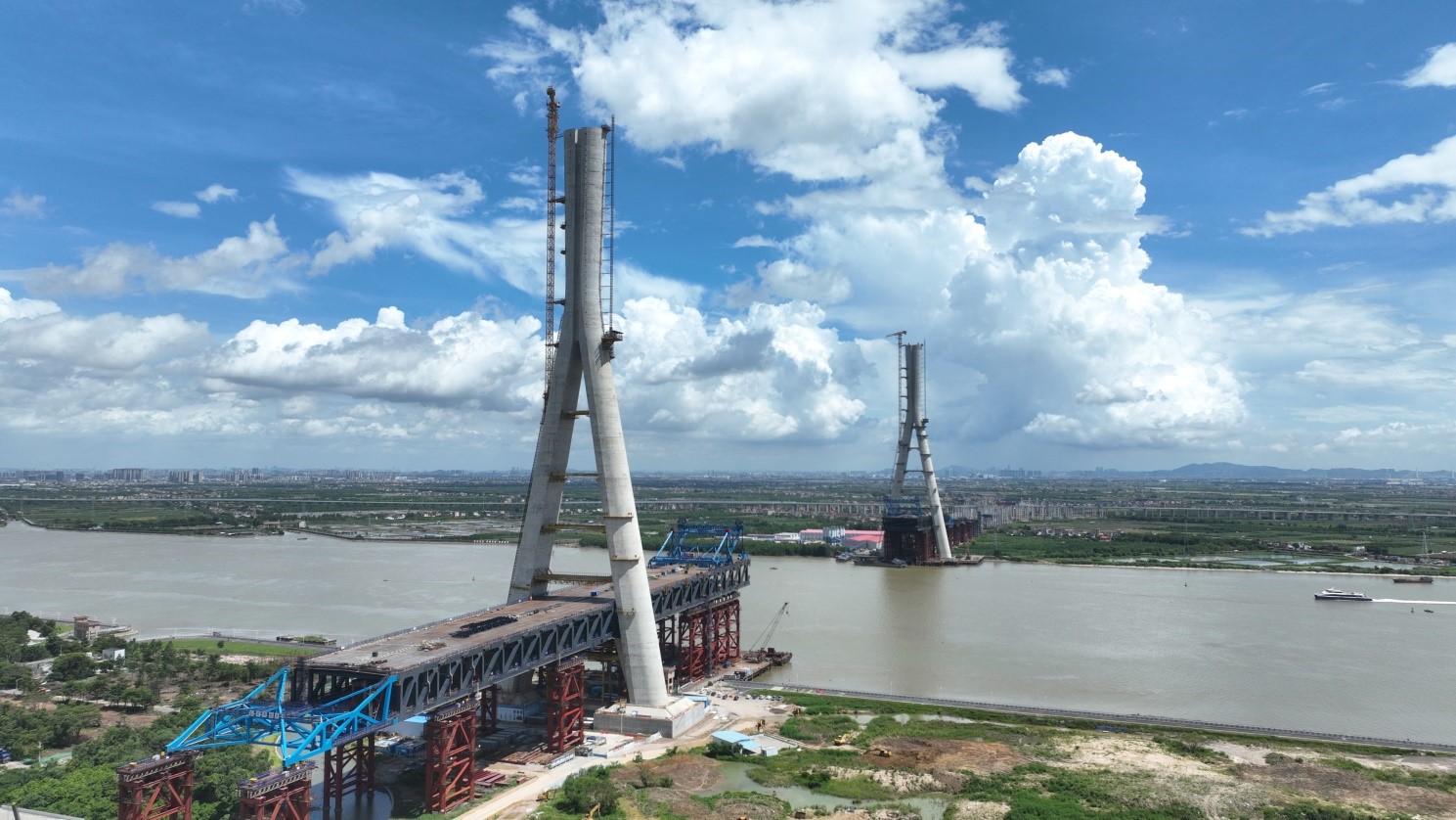 香山大桥集“超大跨径、超宽桥面、超重荷载、超大索力”于一身。建成后将创下三项纪录:成为世界上跨径最大的双层公路桁架梁斜拉桥、国内最宽的双层钢桁架公路斜拉桥,以及广东省内跨径最大的斜拉桥。