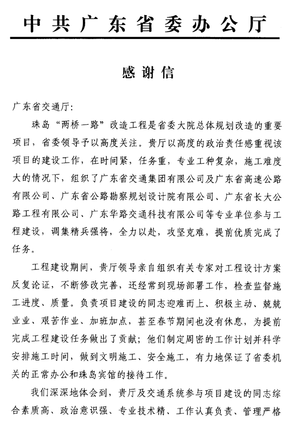 省委关于珠岛“两桥一路”改造工程的《感谢信》
