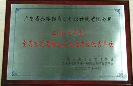 日前,在郑州召开的第四届全国交通运输企业文化建设论坛上,我公司被授予2009年度“全国交通运输企业文化建设优秀单位”荣誉称号。 此次表彰,由中国交通企业管理协会和交通行业优秀企业管理成果评审委员会发起和评审,全国共有123个单位获奖,其中交通规划勘察设计单位5家。