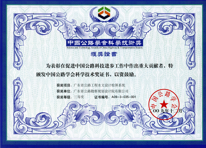 “2009年度中国公路学会科学技术三等奖”
