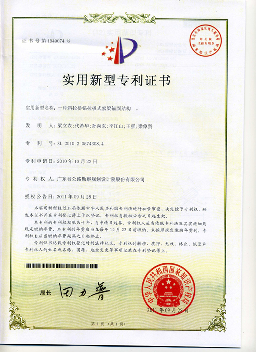 公司研发的“一种斜拉桥锚拉板式索梁锚固结构”技术,于2011年9月28日被中华人民共和国国家知识产权局授予实用新型专利权。
