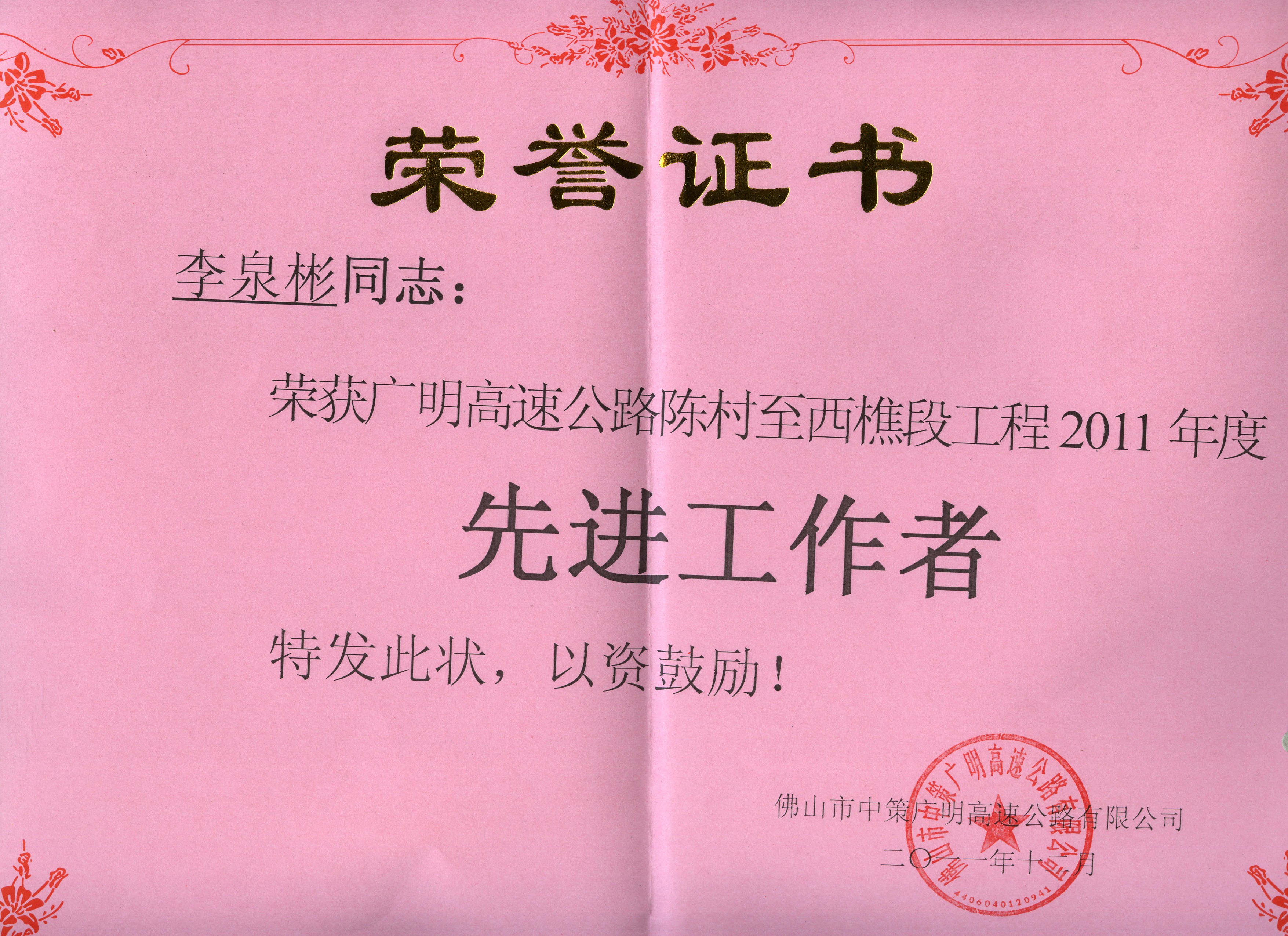 近日,第三路桥设计部设计代表李泉彬同志受到业主单位佛山市中策广明高速公路有限公司表彰,荣获广明高速陈村至西樵段工程2011年度“先进工作者”称号,为公司树立了良好的外部形象,赢得了荣誉,特表祝贺。