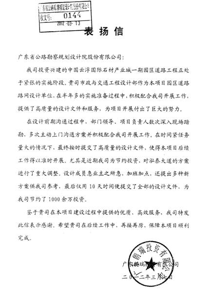 近日,广东朗瑞投资有限公司向公司发来表扬信,对市政与交通工程部在云浮国际石材产业城一期园区道路路网项目中提供的“高效、优质”的设计文件和服务给予了充分肯定和高度赞扬。特表祝贺!
