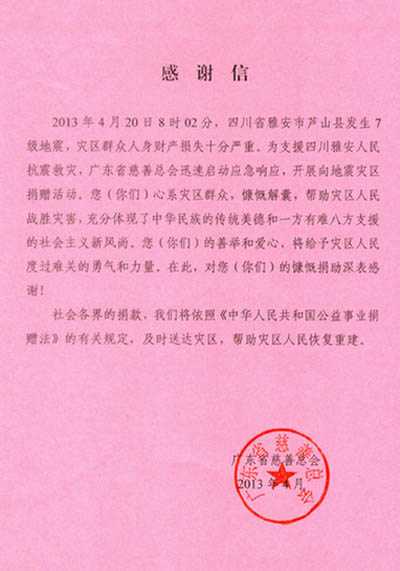 公司向雅安震区人民献爱心捐款
