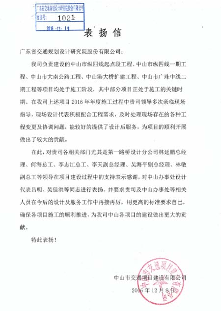 近日,中山市交通项目建设有限公司发来表扬信,对我司在中山市纵四线起点段工程、中山市纵四线一期工程、中山市大南公路工程、中山港大桥扩建工程、中山市广珠中线二期工程等项目中提供的优质、高效、负责的设计后服务表示赞扬,同时对我司第一路桥设计分公司有关人员给予通报表扬。特此报喜!