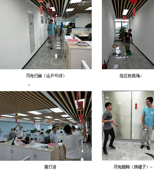 天花板下悬挂了一串串灯笼和灯谜;在办公区的4个方位还设置了“月兔蹴鞠”“月兔归巢”“安能辨我是雌雄”以及指压板跳绳等游戏区和兑奖区,吸引大家参与其中。节日的气氛洋溢在现场的每个角落。赢取到游戏中的精美礼品的大伙儿满载而归,在欢声笑语中提前度过了一个快乐而有意义的中秋佳节。