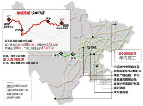 雅安至康定高速公路项目起于雅安雨城区草坝镇,经过雅安雨城区、天全县、泸定县、康定县后,止于康定菜园子,与正在建设的乐山至雅安高速连接。此高速将按四车道高速公路标准建设,设计速度为每小时80公里,路基宽度24.5米,路线全长141公里,桥隧比约80%;其中,二郎山隧道为该项目的控制性工程,隧道全长13400米。这条高速的建成,将彻底改变甘孜境内无高速的历史。