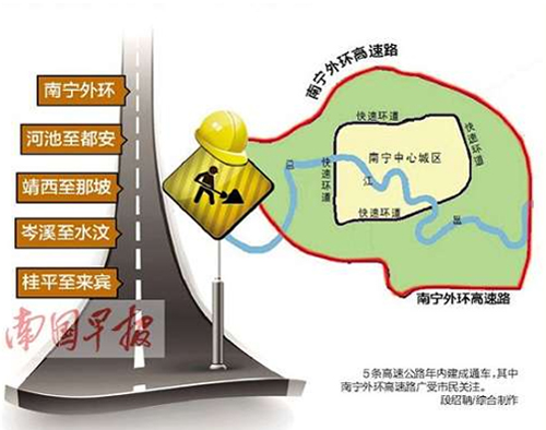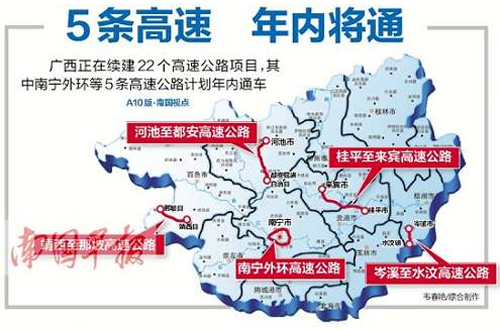今年自治区续建的高速公路项目共有22个,建设高速公路里程2270公里。计划年内建成通车的南宁外环、河池至都安、靖西至那坡、岑溪至水汶、桂平至来宾5条高速公路,目前正紧张有序地开展路面基层、面层、交安、房建、绿化等各项施工,进展顺利,计划新增高速公路里程约389公里。其他17个续建项目中,完成计划总投资在70%以上的项目有6个,其中百色至靖西、阳朔至鹿寨、灌阳至凤凰完成计划总投资超过80%。此外,计划年内开工吴圩机场至大塘、河池至百色、沿海高速公路改建工程南间至钦州段、柳州至南宁高速公路改扩建工程4个项目,开工里程超过600公里;力争开工荔浦至玉林、乐业至百色、松旺至铁山港等高速公路项目。