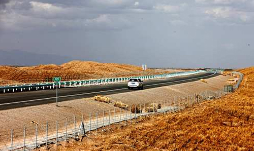 采用风积沙填筑施工,降低了工程造价,却大大增加了施工难度。风积沙筑路不同于常规路基填料,必须采取特殊的施工工艺和压实方法,以确保施工质量。在施工过程中,又遇到气温高、风积沙失水过快的难题。技术人员最后选择了每隔一公里打一口井,用水管给风积沙灌水的方法解决了问题。整个项目建设中,共用了1800万立方米风积沙,施工难度可见一斑。据粗略统计,项目全线因采用风积沙材料节约十多亿元的资金。
